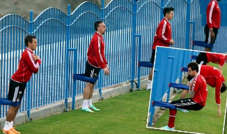 Winter warmer: Stretching and holding hands are part of the Germans training regime