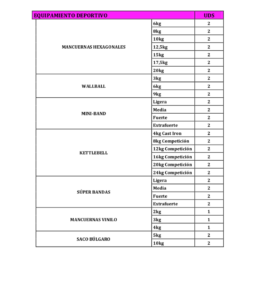 Material funcional diverso (barras, kettlebells, mancuernas, balones, aparatos de trabajo aeróbico…).