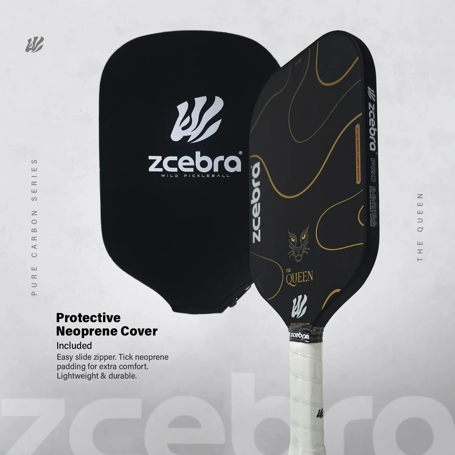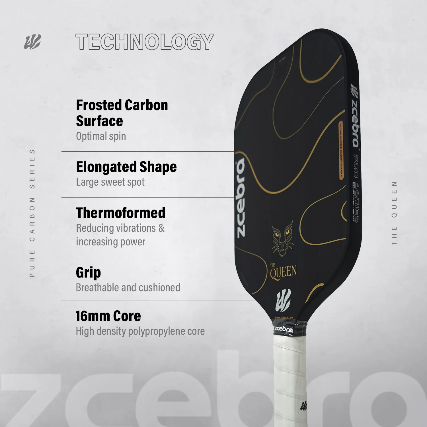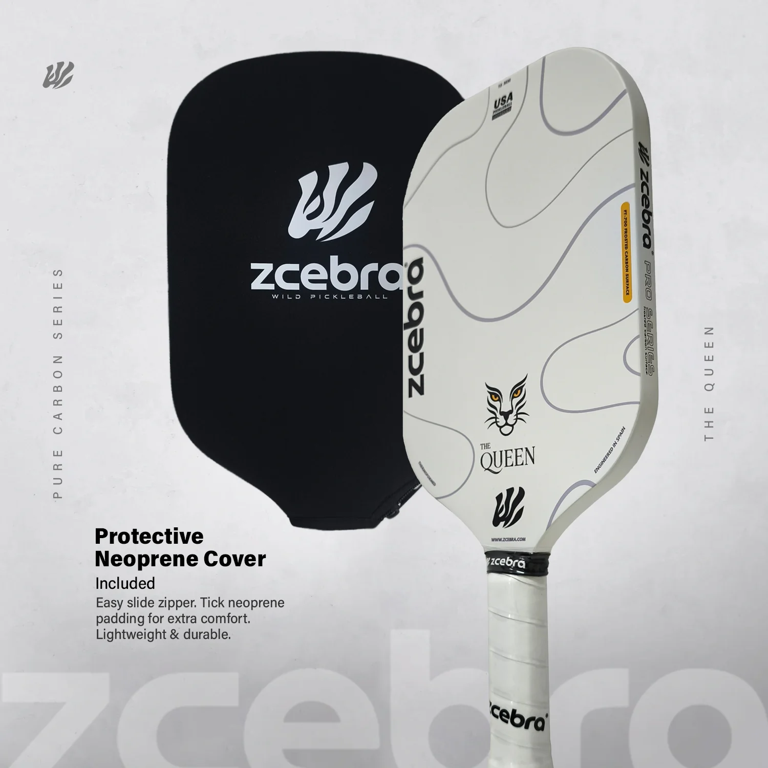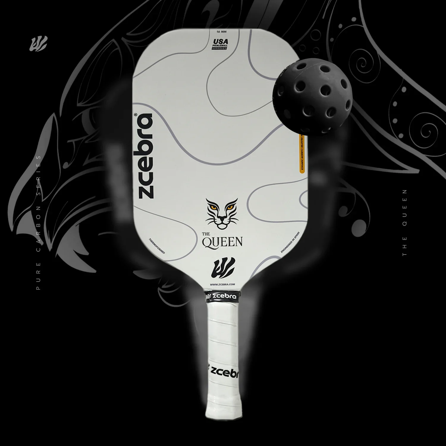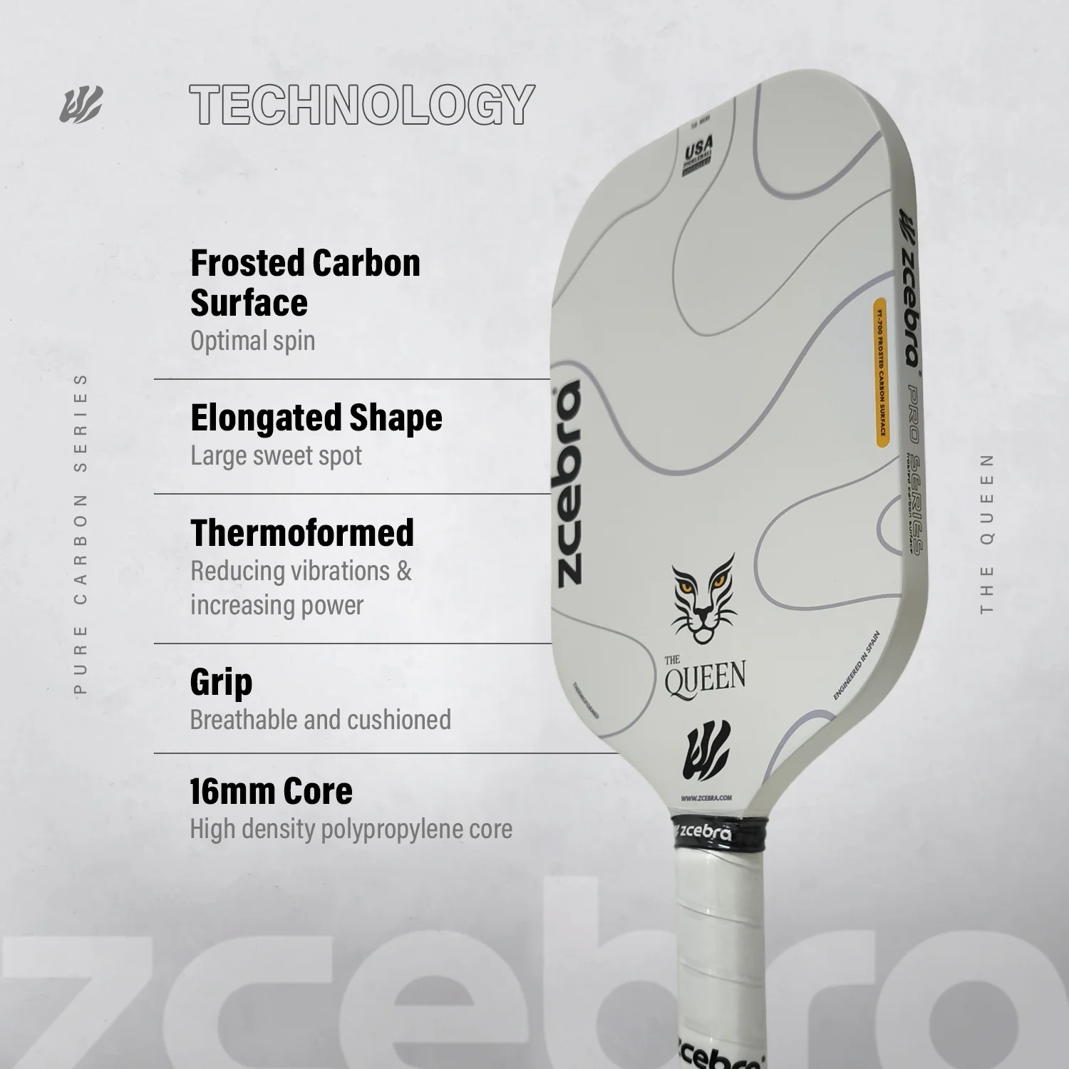 Una elegante y verdadera pala de Pickleball. La Zcebra THE QUEEN te ofrece un control increíble para juegos desde el fondo de la pista y la cocina.