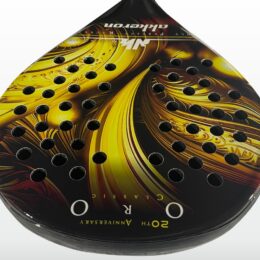 La pala de pádel modelo Oro 20th de la colección Dream Line de Akkeron incorpora un nuevo protector de última generación, con un diseño renovado, que recubre todo el lateral para su total protección, junto con la posibilidad de nuevos contrapesos para equilibrar el producto como lo desees y obtener un tipo de balance más personalizado. Este protector diseñado para no debilitar el marco, ya que no va taladrado si no pegado en tres partes, y que puede ser sustituido si sufriese daños sin problema por uno nuevo, quedando el producto totalmente intacto y listo para el juego en cuestión de segundos.
