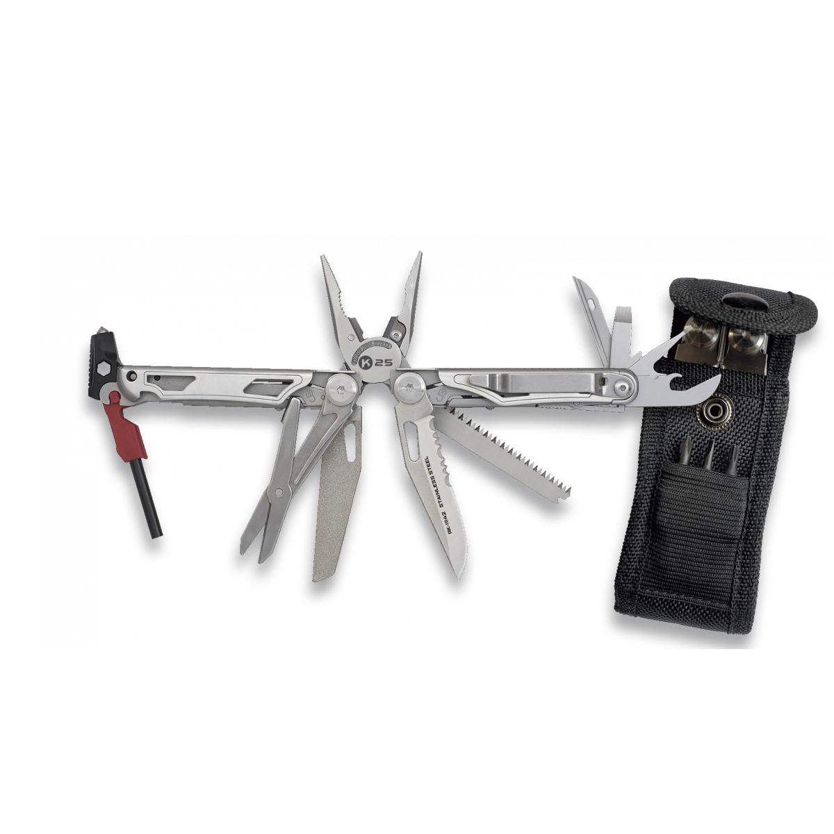 Alicate tactico multiusos K25, 17 usos , incluye funda de nylon y set de puntas