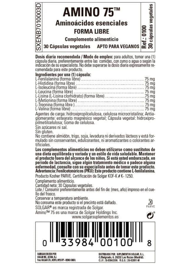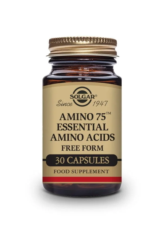 Solgar® Amino 75 combina los 8 aminoácidos esenciales L-lisina, L-leucina, L-fenilalanina, L-valina, L-metionina, L-histidina, L-isoleucina y L-treonina. Esta combinación está indicada para tomar una vez al día y se presenta en cápsulas vegetales fáciles de tragar.