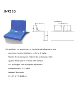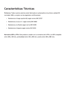 Nuestros asientos con respado y abatibles cumplen la normativa UEFA/FIFA para instalaciones deportivas. La norma especifica un respaldo entre 300 y 350 mm, una profundidad entre 350 y 400 mm y un ancho entre 400 y 480 mm.