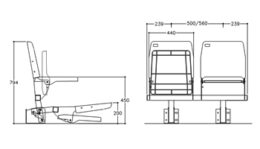 Sistema de bancada formada por estructura metálica donde van alojadas el asiento con rayado anti-deslizante y el respaldo (polipropileno inyectado) y que mediante un resorte manual permite abatirse de forma que todo el conjunto pueda ser instalado en una tribuna telecópica y poder ser cerrada abatida en 200mm de altura / Tratamiento de material en pintado epoxi o galvanizado frío