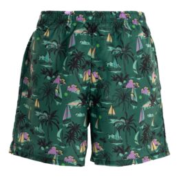 Sumérgete en el verano con estilo con este bañador de la marca Softee, diseñado para quienes buscan comodidad y un look vibrante. Su estampado tropical con palmeras, veleros y ambiente de playa en tonos verde oscuro, amarillo y lila te transportará a la costa en cada uso.