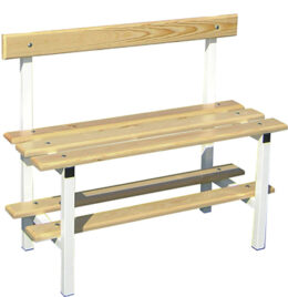 Banco formado por estructura metálica (patas) de sección de tubo 35x35mm, lacadas en blanco con pintura poliéster y listones de madera de pino melis de sección 90x20mm.