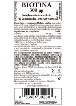Solgar Biotina 300 µg Comprimidos contiene 300 µg de la vitamina B hidrosoluble biotina. Quizá es más conocida por sus propiedades cosméticas, especialmente porque ayuda a conseguir que el cabello crezca sano y brillante. La biotina se añade con frecuencia a los productos de belleza, pero la absorción a través de la digestión es mucho mayor que cuando se aplica a la piel.