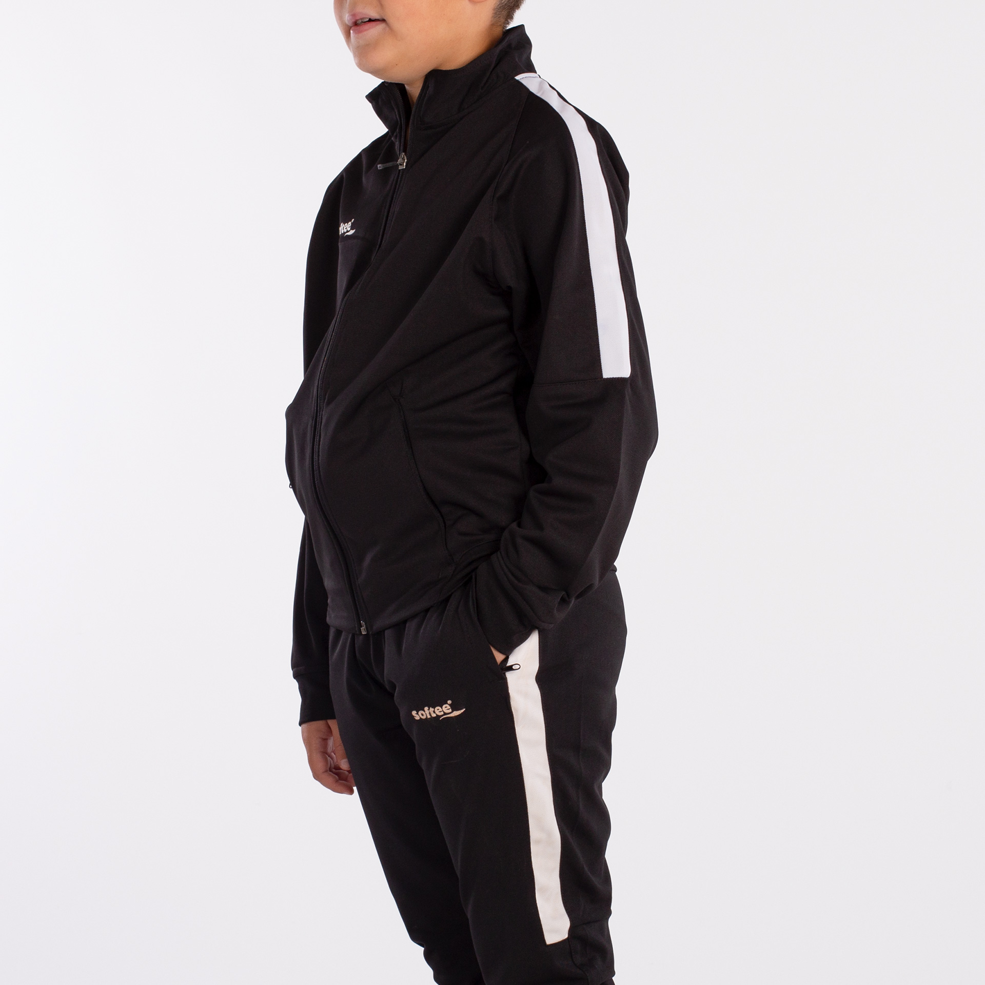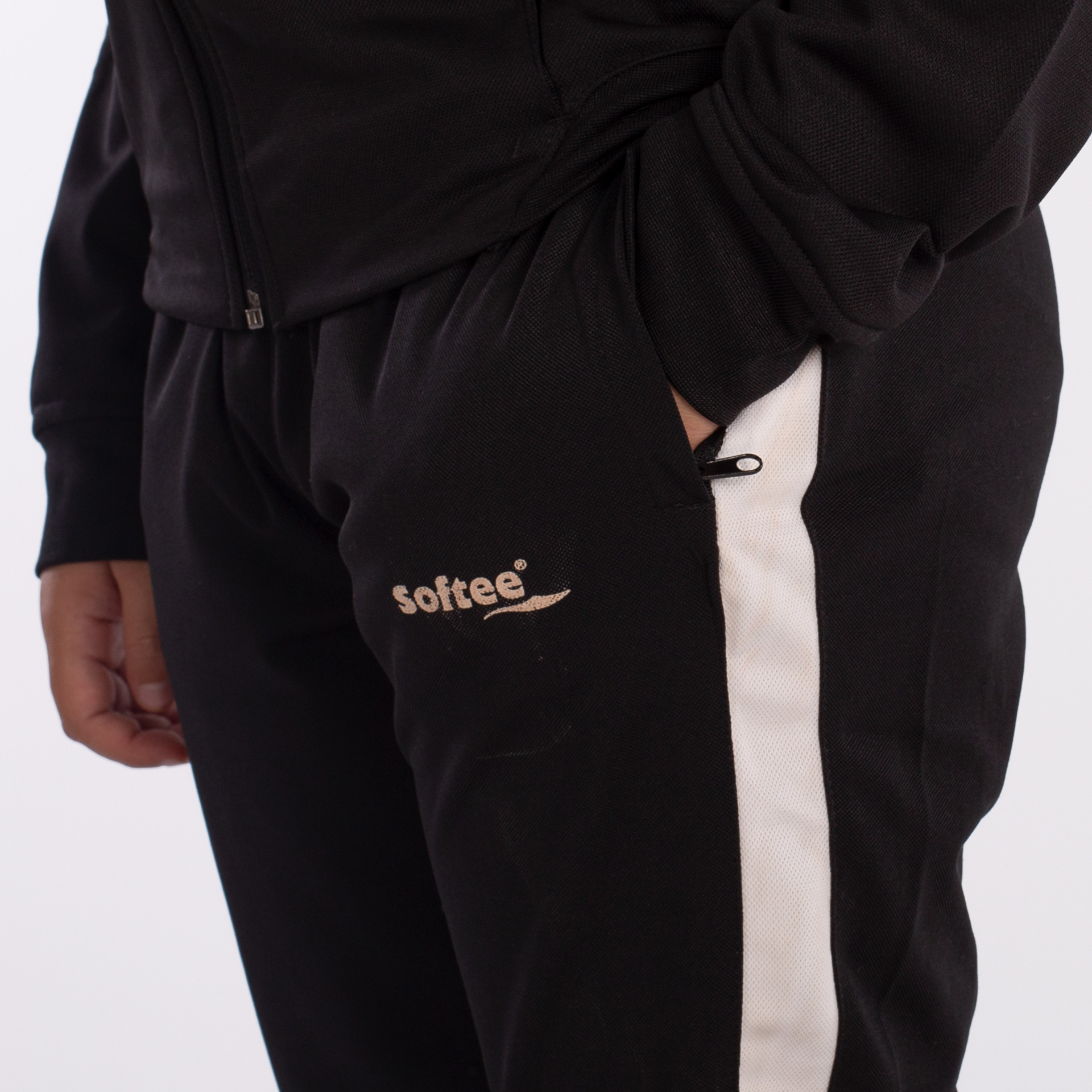 Chándal combinado con diseño lateral. Pantalón de corte estrecho con puño y cintura ajustable. Chaqueta con cremallera frontal, puños y cintura elástica. Cuenta con bolsillos laterales con cremallera. Gramaje: 260gsm. Tallas: 6, 8, 10, 12, 14 años, S, M, L, XL, XXL.