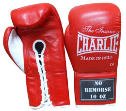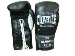 Guantes de Boxeo No Remorse de la marca Charlie son unos guantes profesionales de combate con sierre de cuerdas y hechas en piel de primera calidad.