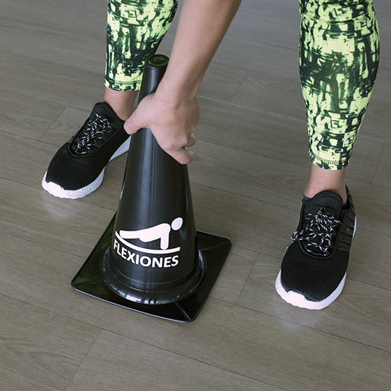 Conos semirrígidos de 23cm de altura con diseño de training en vinilo (abdominales, fondos…). Te ayudan a crear cualquier circuito de entrenamiento con diferentes ejercicios.