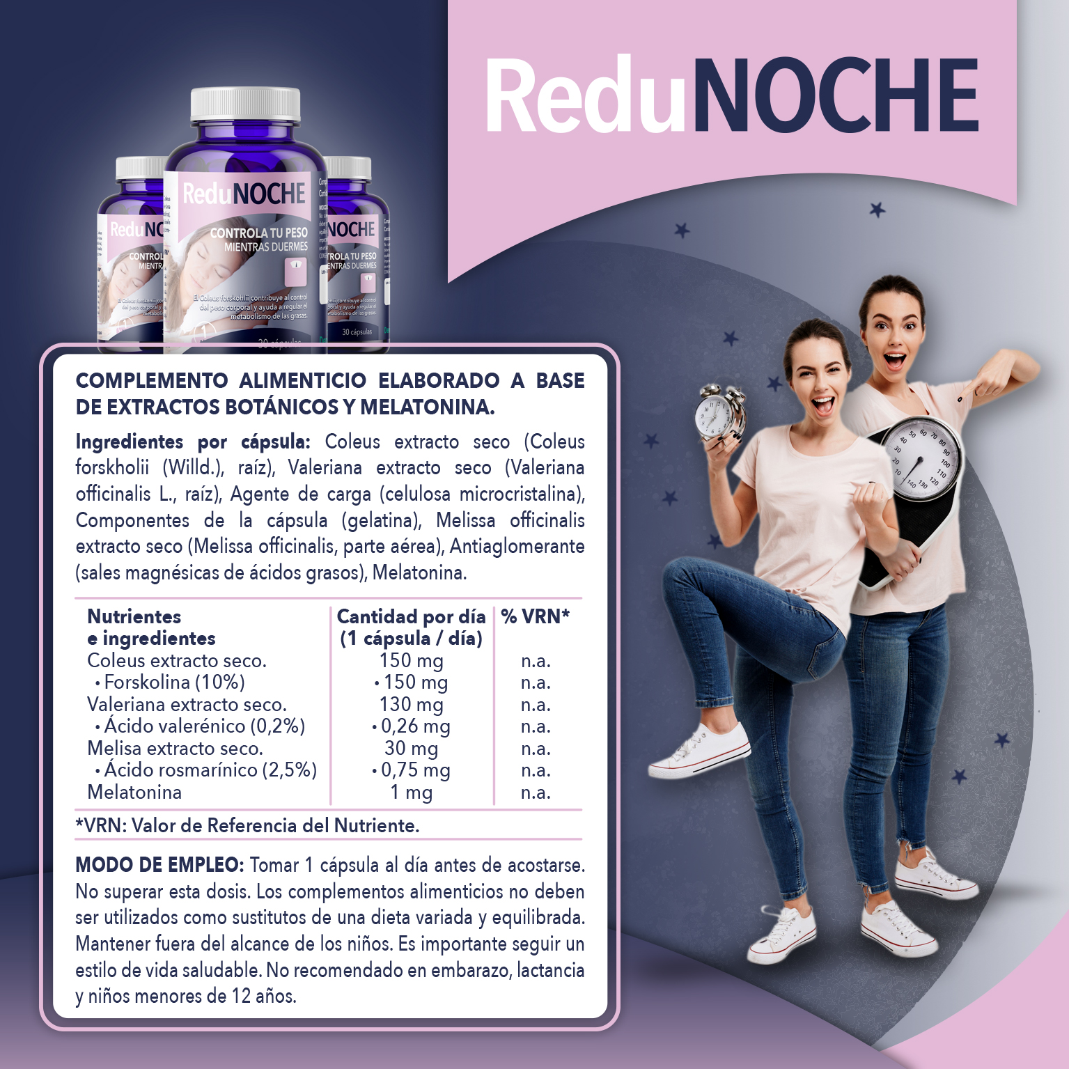 Redunoche es un adelgazante quemagrasas muy potente que actúa eliminando la grasa localizada del organismo durante las horas de sueño. Está compuesto principalmente por tres principios activos como son la Forskolina, la Melatonina y la Valeriana, cuya combinación tiene un efecto realmente efectivo mientras duermes. Cada tarro contiene 30 cápsulas, que son muy fáciles de ingerir. Se recomienda hacer el tratamiento completo de 30 días, pudiendo alargarlo hasta 3 meses, periodo máximo en el cual se recomienda descansar un mes. Posteriormente puede volverlo a tomar en caso de ser necesario. Redunoche tiene un efecto adelgazante incluso sin dieta y ejercicio, aunque recomendamos una dieta saludable y ejercicio moderado para aumentar sus efectos. También puede utilizar Redunoche para potenciar el efecto de su dieta, como la dieta keto, dieta de ayuno intermitente o dieta cetogénica. Redunoche está indicado tanto para mujeres como para hombres.