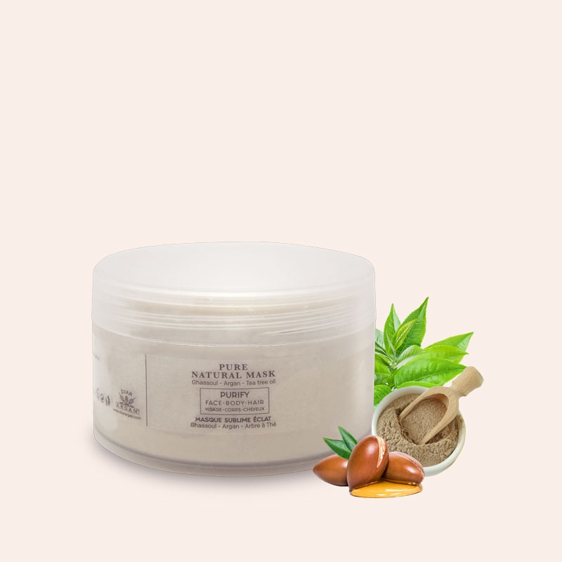 Extracto de aceite de argán puro, polvo de ghassoul, extracto de higo chumbo, aceite esencial de árbol del té.