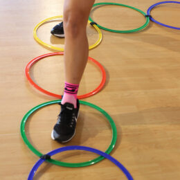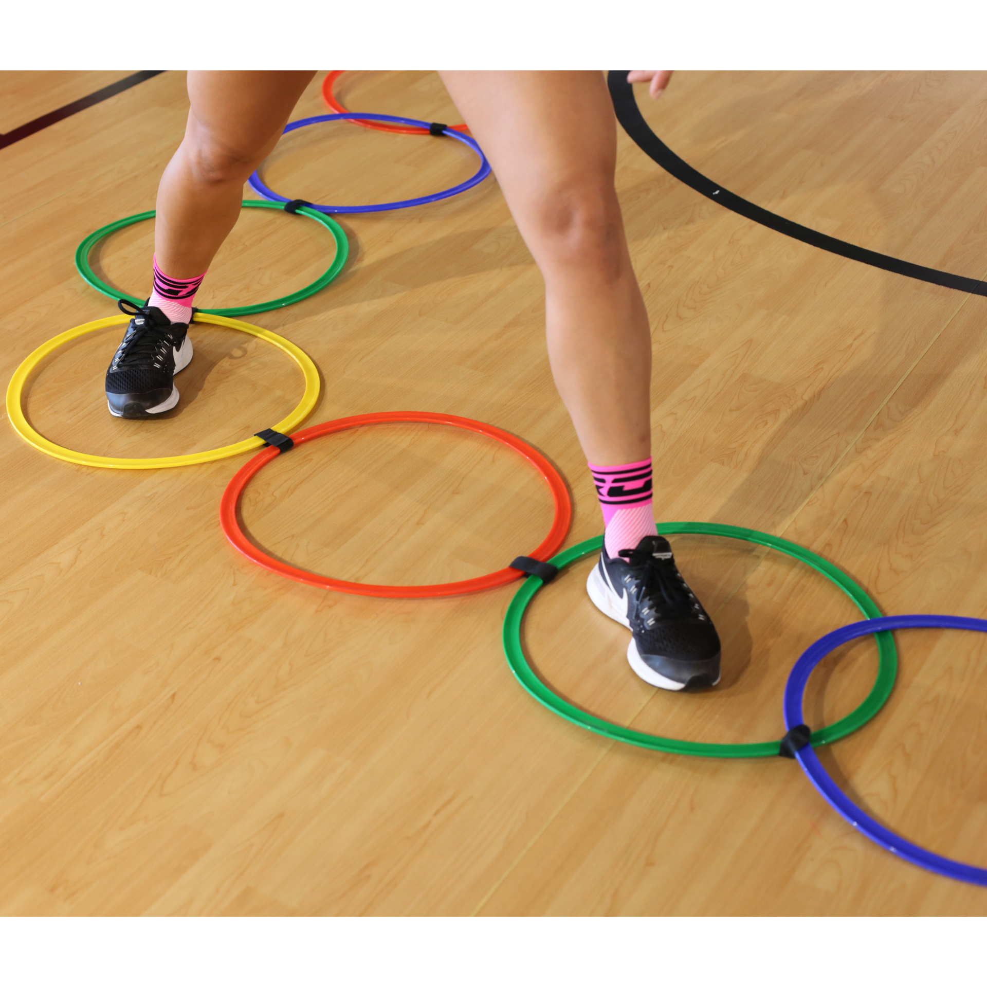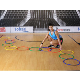 Escalera formada por 12 aros planos de diferentes colores y diámetro de 45 cm unidos mediante argollas de velcro permiten diferentes formas de circuito para entrenamientos de velocidad y ritmo. Hasta 5,40m.