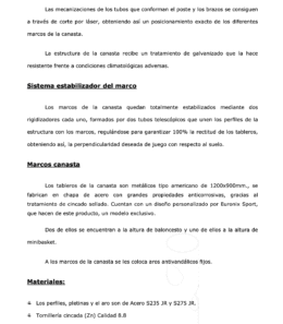 Los marcos de la canasta quedan totalmente estabilizados mediante dos rigidizadores cada uno, formados por dos tubos telescópicos que unen los perfiles de la estructura con los marcos, regulándose para garantizar 100% la rectitud de los tableros, obteniendo así, la perpendicularidad deseada de juego con respecto al suelo.