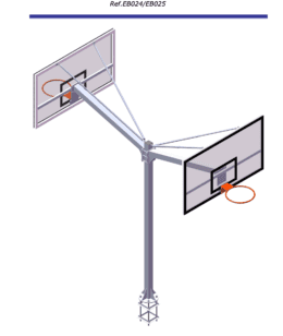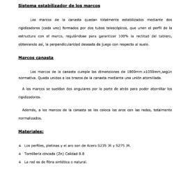 Los marcos de la canasta quedan totalmente estabilizados mediante dos rigidizadores (cada uno) formados por dos tubos telescópicos, que unen el perfil de la estructura con el marco, regulándose para garantizar 100% la rectitud del tablero, obteniendo así, la perpendicularidad deseada de juego con respecto al suelo.