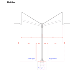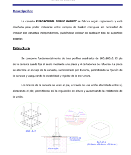 Se compone fundamentalmente de tres perfiles cuadrados de 100x100x3. El pie de la canasta queda fijo al suelo mediante una placa y 4 cartabones de refuerzo. La placa se atornilla al anclaje de la canasta, suministrado por Euronix, permitiendo la fijación de la canasta y asegurando la estabilidad y rigidez de la estructura.