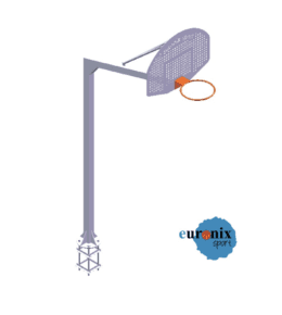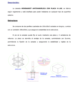 El pie de la canasta queda fijo al suelo mediante una placa y 4 cartabones de refuerzo. La placa se atornilla al anclaje de la canasta, suministrado por Euronix, permitiendo la fijación de la canasta y asegurando la estabilidad y rigidez de la estructura.