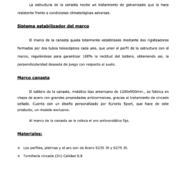 El marco de la canasta queda totalmente estabilizado mediante dos rigidizadores formados por dos tubos telescópicos cada uno, que unen el perfil de la estructura con el marco, regulándose para garantizar 100% la rectitud del tablero, obteniendo así, la perpendicularidad deseada de juego con respecto al suelo.