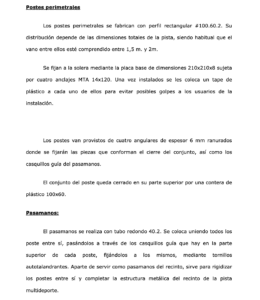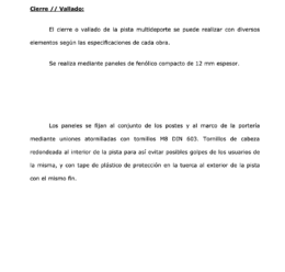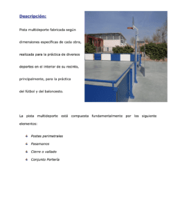 Pista multideporte fabricada según dimensiones específicas de cada obra, realizada para la práctica de diversos deportes en el interior de su recinto, principalmente, para la práctica del fútbol y del baloncesto.
