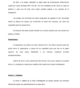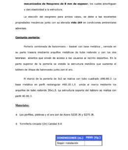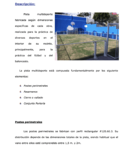 Pista multideporte fabricada según dimensiones específicas de cada obra, realizada para la práctica de diversos deportes en el interior de su recinto, principalmente, para la práctica del fútbol y del baloncesto.