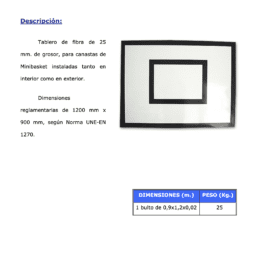 Tablero de fibra de 25 mm. de grosor, para canastas de Minibasket instaladas tanto en interior como en exterior.