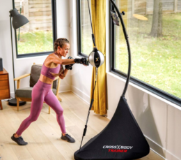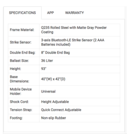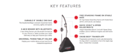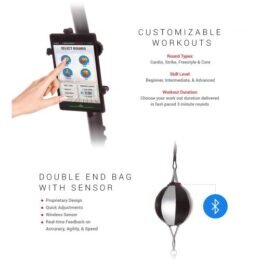 El nuevo equipo de Nexersys para cardio fit boxing. Para entrenamiento individual o clases grupales (fácil de recoger sin ocupar espacio). Regulable en altura. Bolsa de agua como peso sobre la base de la estructura móvil (la bolsa se sujeta y se quita del mástil lo que facilita al movimiento ya que se puede sacar la bolsa). Sensor de pegada que conecta vía Bluetooth con el móvil/tablet.