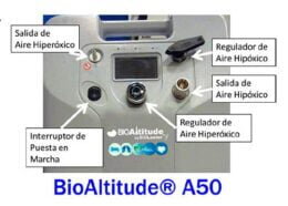 - Módulo de Aire Hipóxico que emite aire a través de la “Salida de Aire Hipóxico” con un flujo y concentración de O2 variables en función de la regulación y que oscila en cuanto a flujo entre los 18 l/min y los 50 l/min, con unas concentraciones de oxígeno que van desde el 9% (altitud simulada de 6500 metros sobre el nivel del mar) hasta el 20% (altitud simulada de 300 m sobre el nivel del mar) de O2. En altitudes simuladas de hasta aproximadamente 3500 metros el BioAltitude® A50 nos da un flujo de 43 litros/minuto.