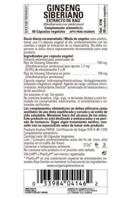 Solgar Ginseng Siberiano Extracto de raíz recomienda una dosis diaria de 1 cápsula vegetal al día, aportando extracto estandarizado de raíz de ginseng siberiano 0,75mg (0.5% de eleuterósido E, 0.45 (0.3%) de eleuterósido B junto a raíz de ginseng siberiano en polvo.