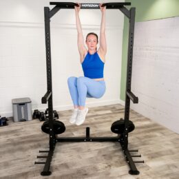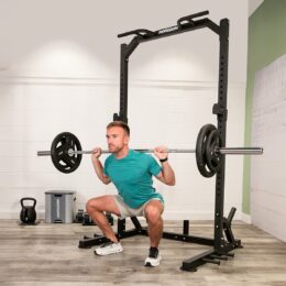 El Half Rack HHR50 es una estación de entrenamiento compacta y robusta, ideal para realizar sentadillas, press banca, press de hombros, peso muerto y ejercicios de peso corporal. Diseñado para adaptarse a tu espacio doméstico, ofrece versatilidad, seguridad y durabilidad en cada sesión.