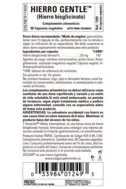 Gentle IronTM de Solgar® es una forma de hierro bisglicinato, una forma única de hierro altamente absorbible. Una cápsula al día aporta 20 mg de hierro en forma de bisglicinato ferroso, una forma de hierro bien tolerada que no produce molestias intestinales.
