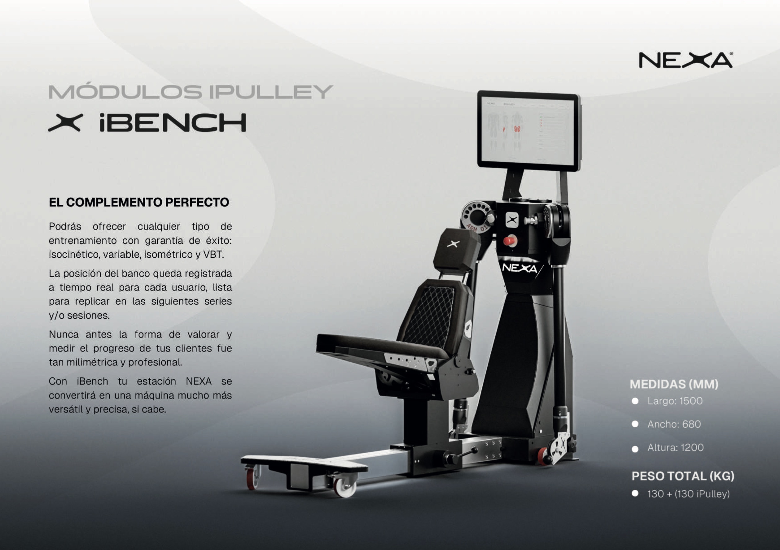 - Entrenamiento isocinético, variable, isométrico y VBT en un solo equipo.