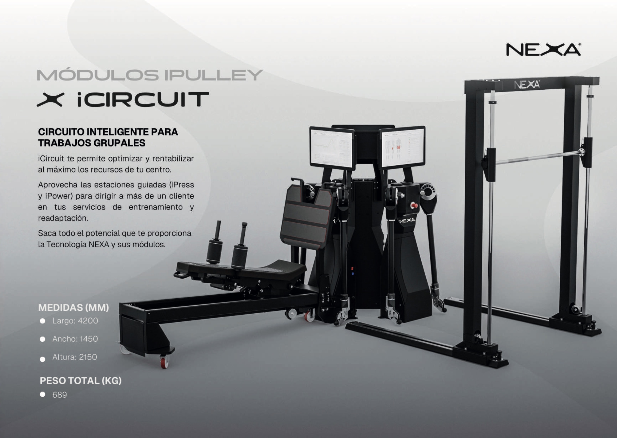 Esta solución es un sistema inteligente de poleas dobles para carga diseñado para ofrecer sesiones precisas, completamente adaptadas a cada usuario y 100% medibles para los profesionales. Su tecnología y su estructura compacta hacen de esta polea doble la herramienta ideal para centros deportivos, clínicas de rehabilitación, entrenadores personales y fisioterapeutas que buscan ofrecer lo mejor a sus clientes.