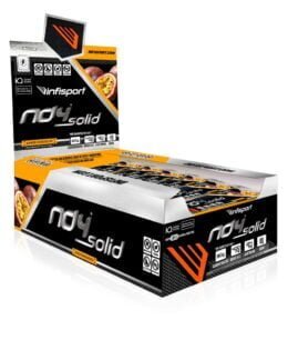 Infisport ND4® SOLID con y sin cafeína sabor maracuyá se presenta en cajitas expositoras reciclables que contienen 21 barritas de 40 gramos.