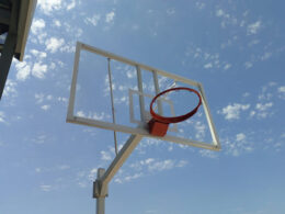ANCLAR SIEMPRE AL SUELO. Juego de 2 canastas para empotrar al suelo mediante una base de anclaje (incluida). Ideal para pistas deportivas de exterior. Vuelo canastas 1,65 mts. Contiene doble sistema de tuercas de nivelación, tanto en soporte de tablero como en base de anclaje, incorpora también dos tirantes superiores de estabilización a las esquinas del tablero. Consulte las diferentes variedades de accesorios que permite, como aros, tableros, redes, protecciones varias.