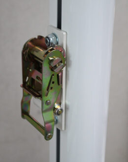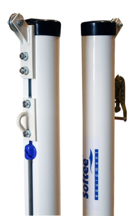 Juego de postes fabricados en aluminio nervado de sección redonda de 90mm. Diseñados para anclar a una base metálica trasladable provista de 2 ruedas de nylon fijas. Dicha base de medidas 80x60cm y fabricada en tubo de acero de sección 40x40x2mm, permite la colocación su parte posterior de un cajón de contrapeso para evitar su vuelco. El peso aproximado de contrapeso debería ser de unos 60/80kg. Incluye carraca tensora para poder tensar el cable de la red que se quiera colocar.
