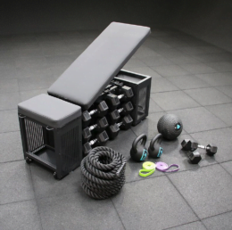 Accesorios incluidos: Cuerda 3,8cmx9m. – Slam ball de 6 y 10Kg, – 2 pares mancuernas 12 caras 2-4-6-8-10-12kg. – Supersmartband Ligera-Media-fuerte-Extra Fuerte.