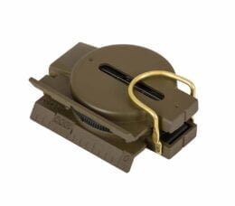 Clásica brújula lensática militar con carcasa de metal y lateral recto para medición.