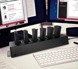 Estación de almacenaje Transcend TS-DPD6P para la cámara DrivePro Body 52. Seis puertos para cargar las cámaras y subir los datos a PC. Se puede conectar en cadena con hasta otras dos estaciones como esta, permitiendo la carga y administración de hasta 18 cámaras. Función de respaldo automático en PC, mediante USB, durante la carga.