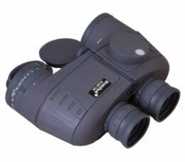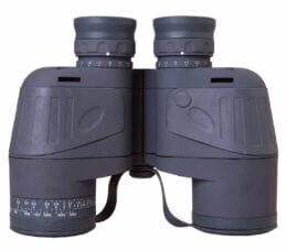 Prismáticos Levenhuk Nelson 7×50 impermeables náuticos y flotantes para cualquier actividad de exterior y especialmente para actividades marítimas o fluviales. Incluyen, integrados, un telémetro y una brújula de iluminación por diodo que funciona con pilas (incluidas). La escala graduada del telémetro, vista desde los oculares, permite medir altura y distancia. Lentes de 50mm de gran apertura y claridad. Prisma de Porro con componentes ópticos Bak4 y recubrimiento multicapa que ofrecen gran nitidez y sin pérdida de luz. Carcasa impermeable de plástico resistente y recubrimiento de goma. Relleno de nitrógeno que evita que las lentes se empañen.