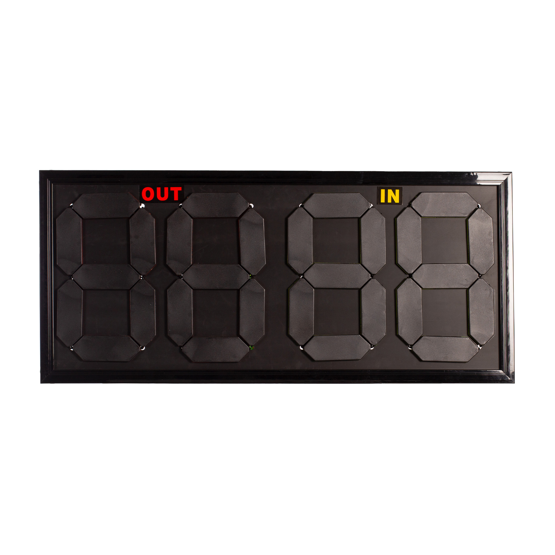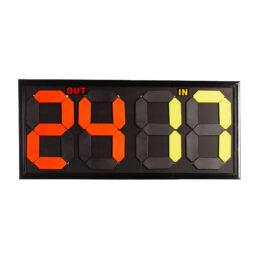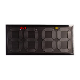 Marcador de cambios (entrada y salida) doble cara. Cuenta con 4 dígitos que se forman con placas reversibles. Numeración del 0 al 99. Medidas: 84×38,5x2cm.