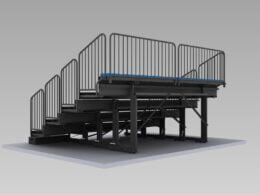 - Barandillas: El graderío presenta una serie de barandillas desmontables a los lados de cada tramo, así como en la parte frontal en el caso de que se haya diseñado con un pasillo delantero. Están fabricadas en perfil de acero curvado (40 mm de diámetro) reforzado con un travesaño que limita los huecos o espacios libres. Son de 1 metro de altura y no presentan ninguna arista que pueda causar daños al usuario.