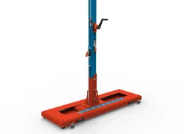 Un estándar de salto con pértiga excepcionalmente estable, construido con montantes de perfil de aluminio de 80×80 mm con recubrimiento de polvo y manivela con un indicador de altura analógico; completo con soportes de barra transversal con palanca de bloqueo rápido, bases de acero pintado en polvo y aluminio con enchufe vertical, y un carro ajustable con un sistema de bloqueo rápido.