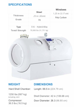 Nuestra cámara más grande y versátil, ya que los médicos y los pacientes tienen la capacidad de tratar hasta 3,0 ATA (29 psi) de presión de funcionamiento. Esta cámara presume de un considerable interior de 42″ de diámetro y, sin embargo, está diseñada para caber en la mayoría de los consultorios y clínicas. Con controles espejados por dentro y por fuera, la Fortius420® ofrece una funcionalidad notablemente segura en una amplia gama de protocolos. Además, esta cámara puede suministrar oxígeno al 100% a un máximo de 3,0 ATA a través de un sistema de montaje de campana para seguir siendo rentable para los médicos y segura para los pacientes. Capaz de enviarse e instalarse en menos de 10 días laborables, este diseño innovador y la tecnología de grado médico garantizan una durabilidad y funcionalidad que durarán años.