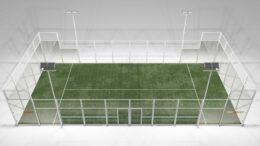 Incluye 4 postes de acero huecos de 6.000 mm que serán la prolongación de los pilares de las estructura a 4 m de las esquinas, con cruceta en la parte superior para posterior instalación de los proyectores.
