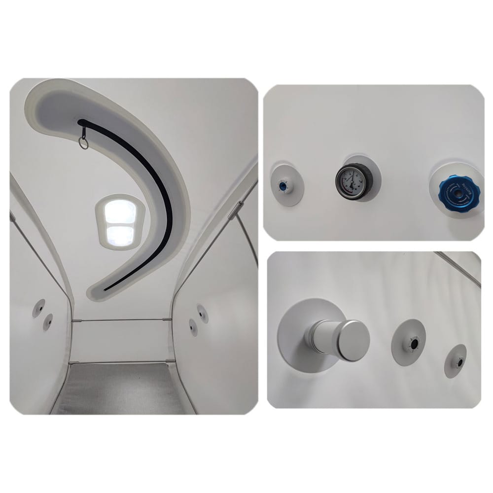 La cámara tiene 2 cremalleras curvas para una entrada/salida cómoda y una válvula de emergencia, para una rápida descompresión en caso de salida urgente.