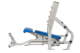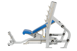 - Inclinación del respaldo regulable en 10 posiciones entre -15° y 30° en intervalos de 5° para realizar ejercicios en banco inclinado, plano o declinado.