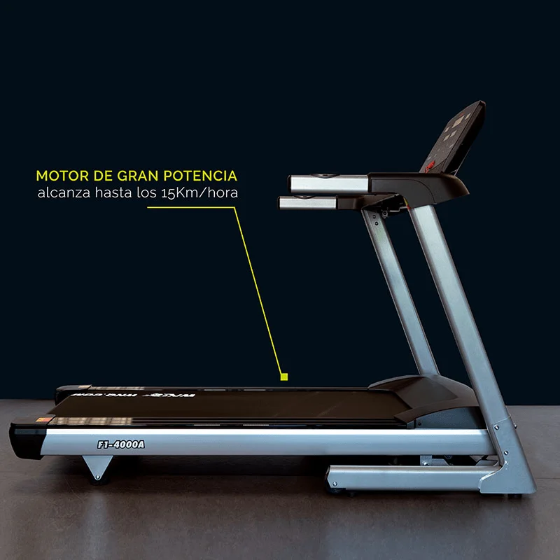 - Cinta de correr para uso doméstico intensivo que alcanza los 15 Km/hora gracias a su potente motor de 2,5CV de potencia.