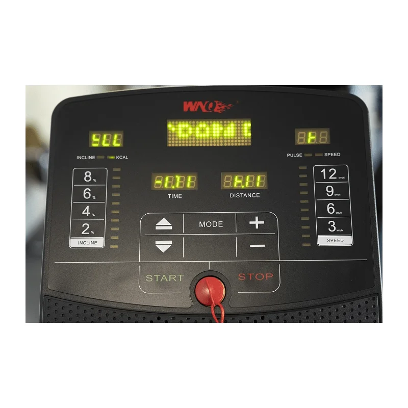 - La consola LED muestra la velocidad, inclinación, distancia, control de pulsaciones por contacto, estimación de calorias consumidas, tiempo y los diferentes modos de entrenamiento.