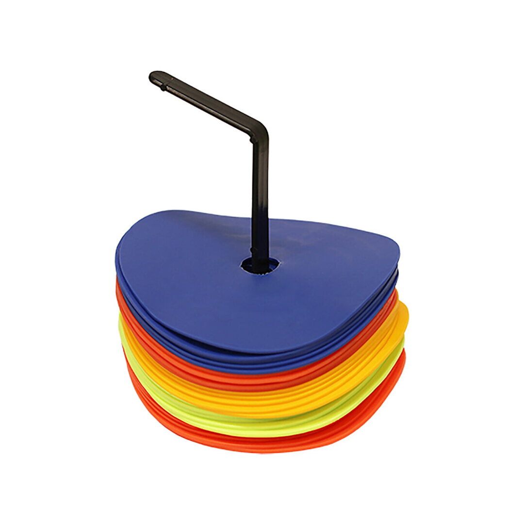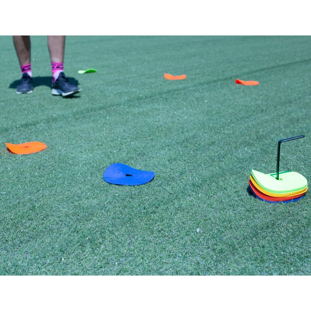 – Set compuesto por soporte y 25 círculos antideslizantes para delimitar zonas de entrenamiento. Compuesto por 5 unidades de cada color de goma (rojo, amarillo, naranja, azul y blanco).