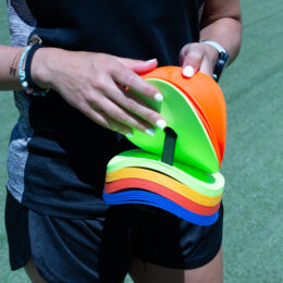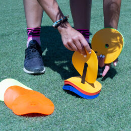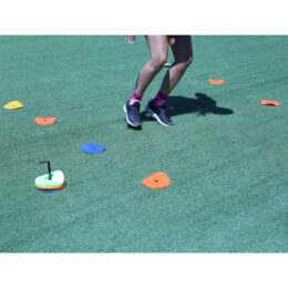 – Set compuesto por soporte y 25 círculos antideslizantes para delimitar zonas de entrenamiento. Compuesto por 5 unidades de cada color de goma (rojo, amarillo, naranja, azul y blanco).